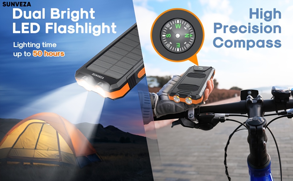 Solar Power Bank Is Also A Powerful Solar Charger! Equipped With Two Bright Flashlights, It Has A Battery Life Of Up To 100 Hours, Continuously Dispelling Darkness For You. Simply Long Press The Power Button For 3-4 Seconds To Turn On The Flashlight, Then Long Press Again To Turn It Off.